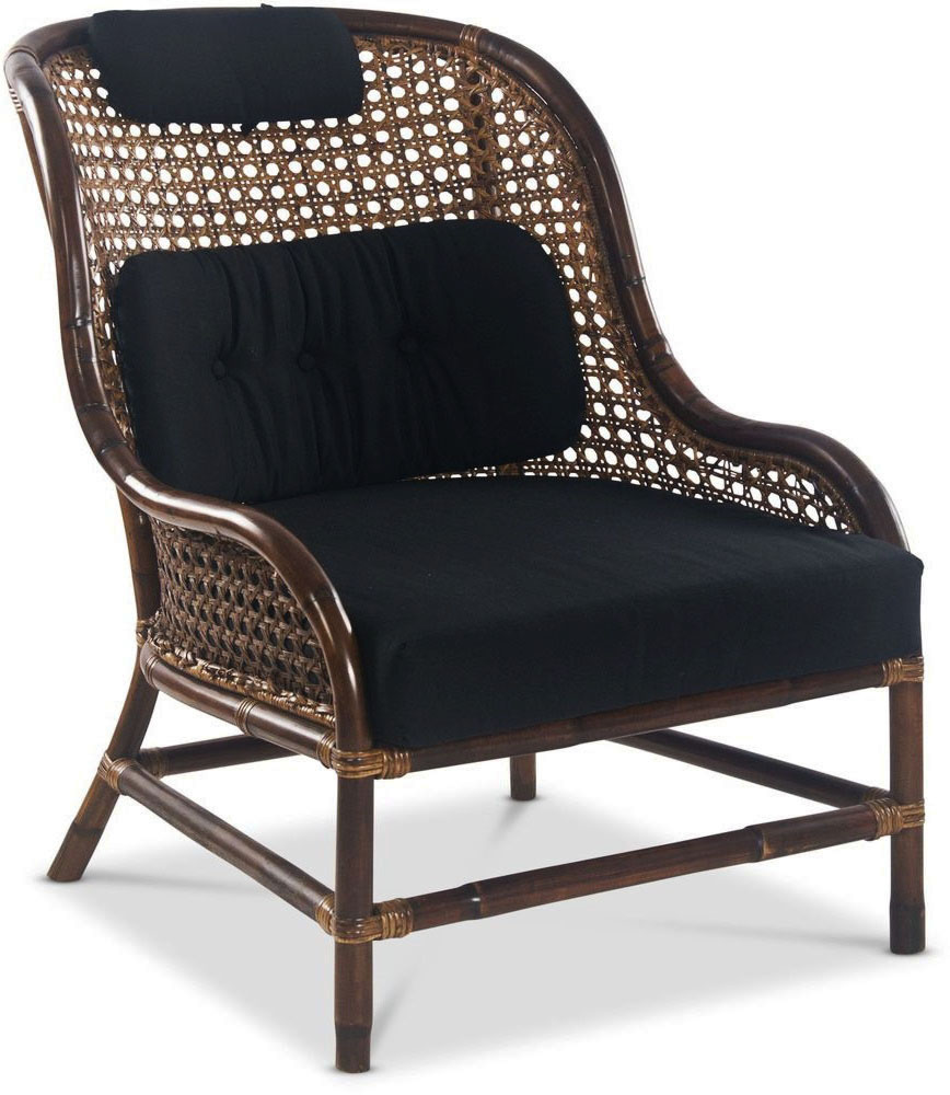 Lenestol med brun rottingramme, flettet ryggstøtte i brunt, komfortabelt svart setepute følger med. En solid og stilig lenestol.
