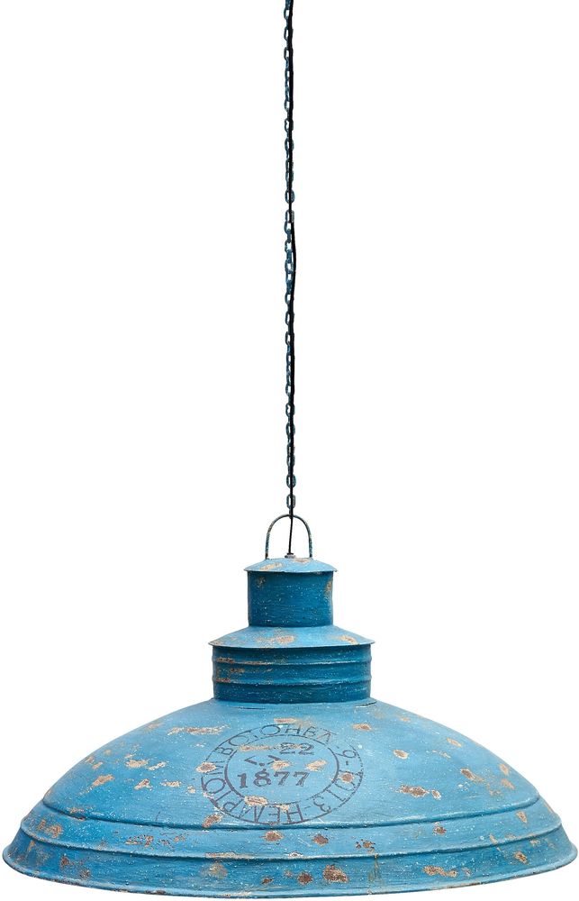 Taklampe i industriell stil, blåfarget. Laget av metall.