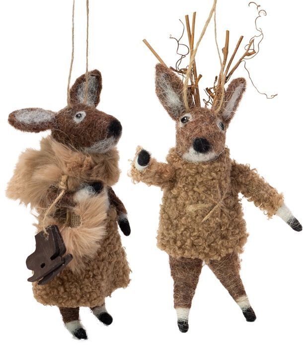 Dekorasjon å henge opp på en egnet plass. Reinsdyrene er håndlaget av syntetisk ull.
