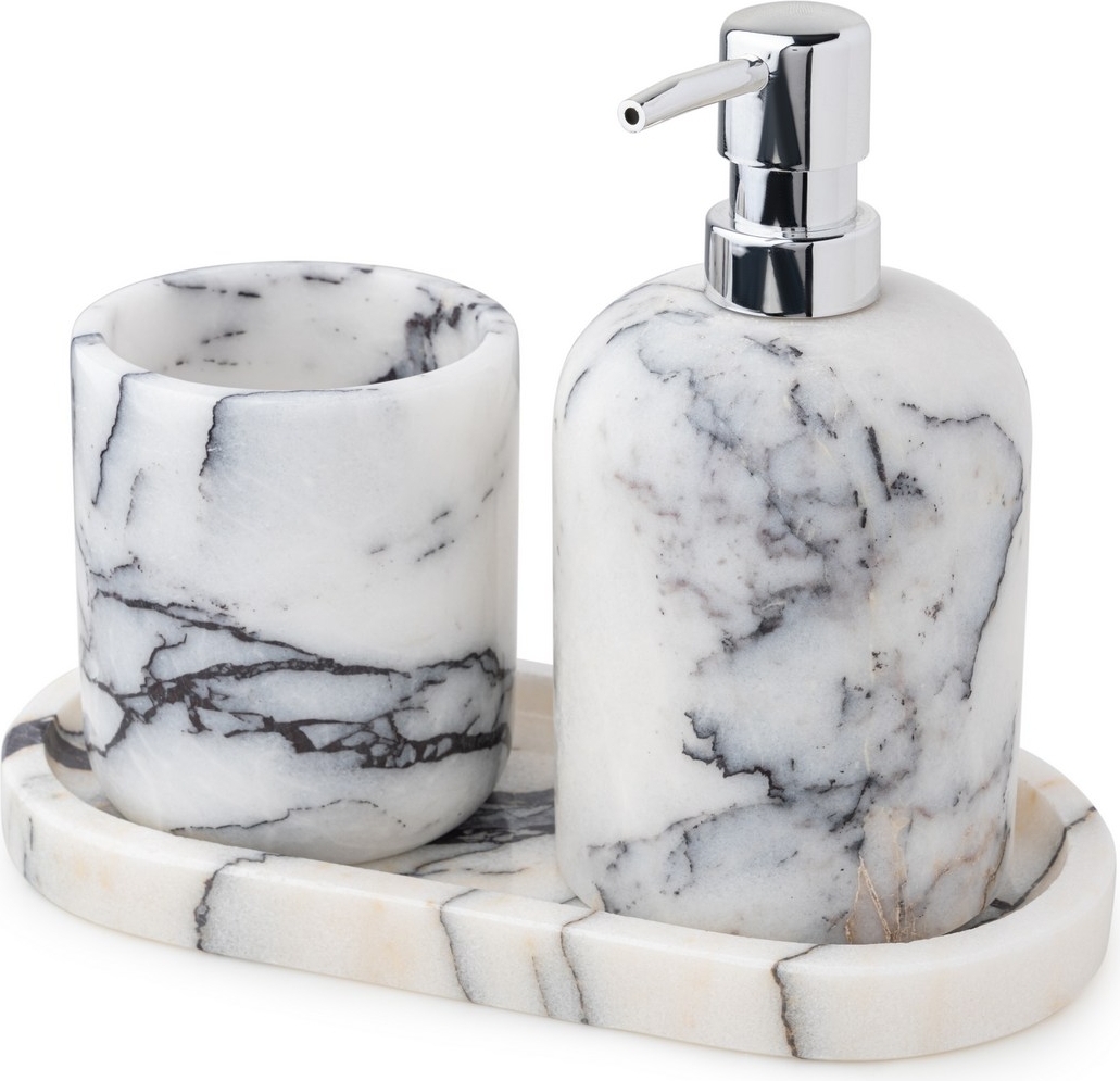 Baderomssett i hvit marmor fra Sicilia med såpeskål, krus og underlegg.