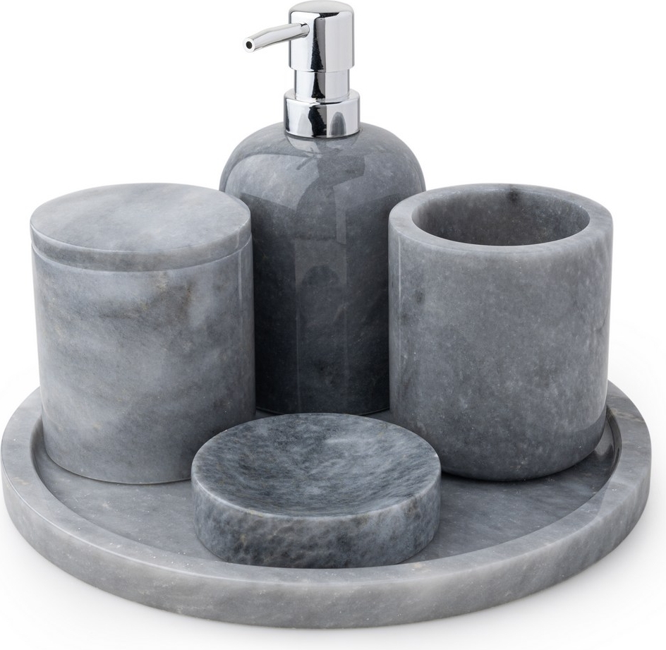 Baderomssett i grå marmor fra Verona med brett, såpebeholder, såpeskål og krus.