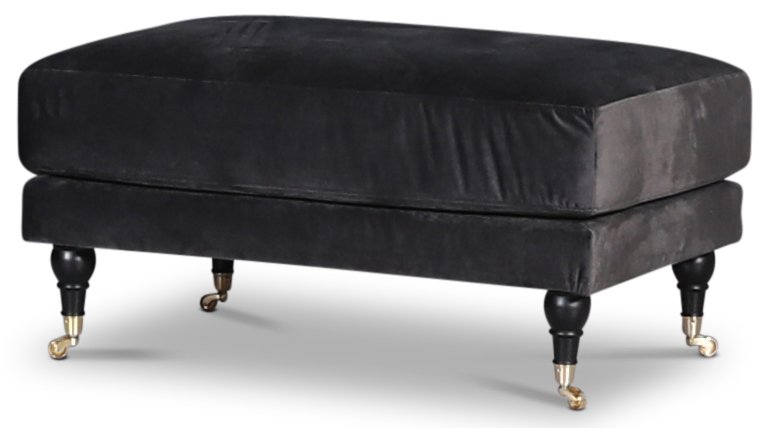 Fotskammelen fins i et mørkegrått mykt fløyels lignende tøystoff. Beina er svarte med messingfarget hjul.
