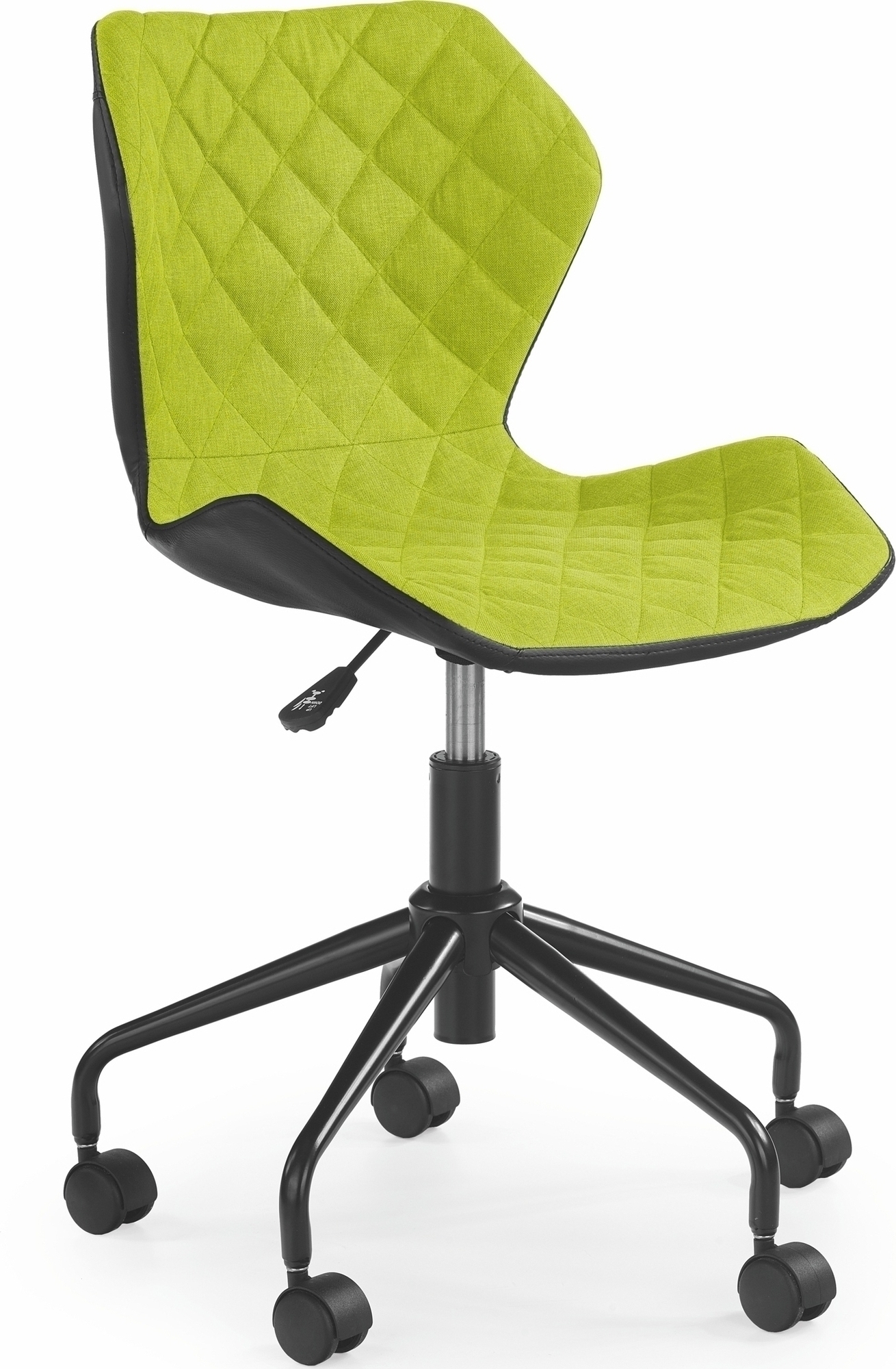 En pen kontorstol med et moderne design. Laget i metall med detaljer i svart plast, og et svært behagelig trekk i svart kunstskinn & grønt stoff. Høydejusterbart sete ved hjelp av spaken under setet og lett å flytte takket være hjulene på stjernefoten.