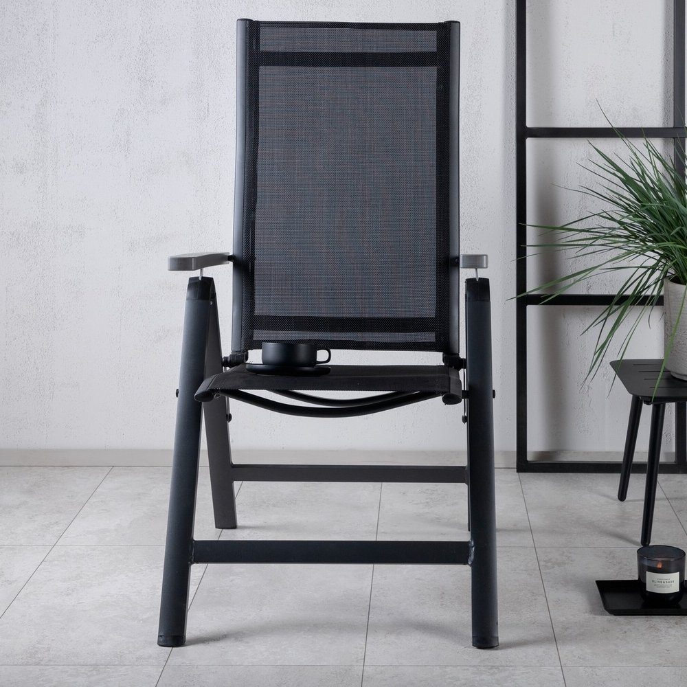 Albany, vår praktiske 5-posisjonsstol i sort farge med armlener for ekstra komfort. Stolen tar seg like godt ut i hagen som på balkongen. Nyt sommeren på den aller beste måten! Vedlikehold: Textilene er et syntetisk stoff laget av PVC-behandlet polyester. Materialet er vannavstøtende og UV-behandlet for å forhindre falming i solen. Rengjøring bør gjøres ca en gang i måneden, bruk en fuktig klut og tørk av.