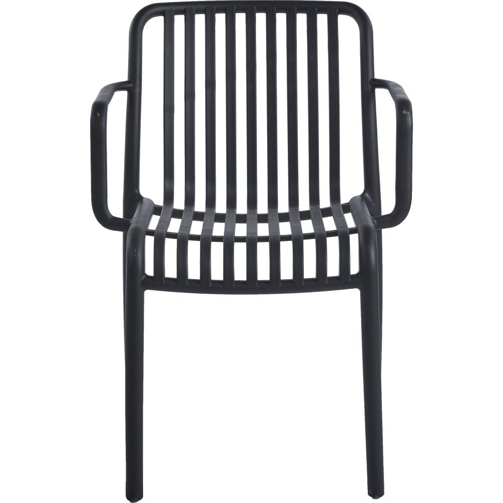 Noa er en sort spisestuestol laget av værbestandig polypropylenplast. Stablebar stol og kan stå ute.