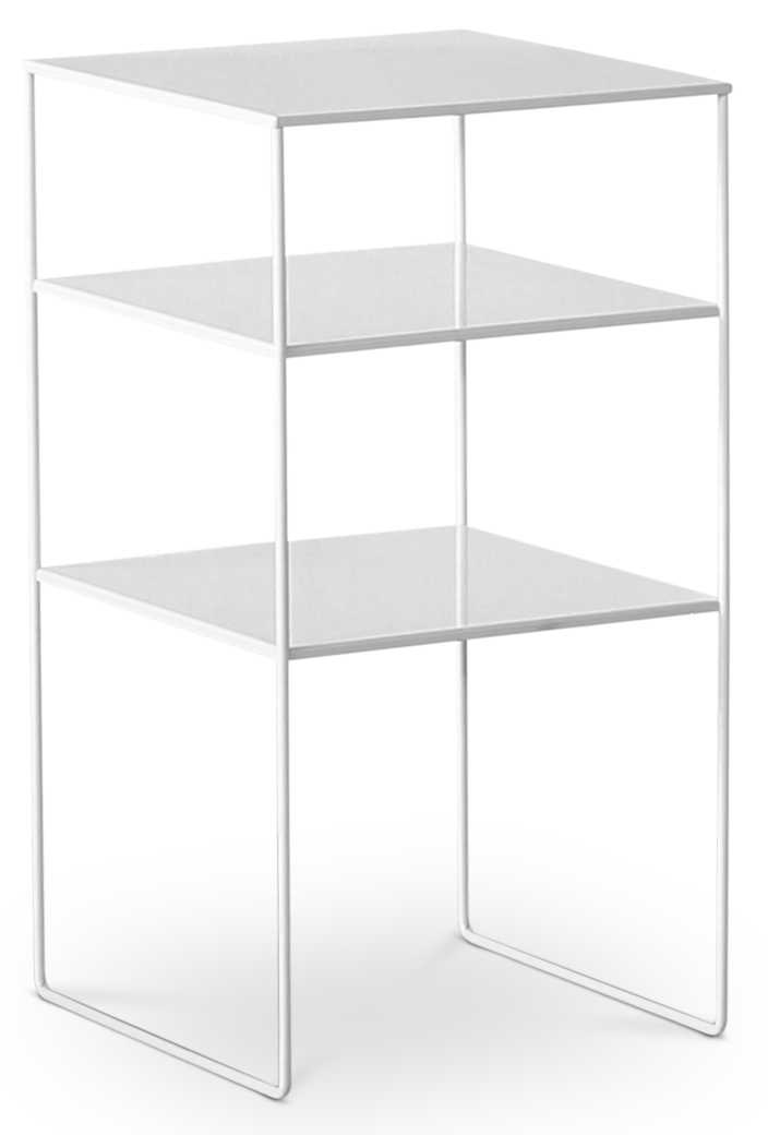 Stilig hvitt nattbord i metall med 3 hyller.