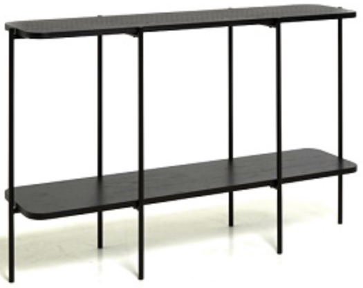 Moderne og stilrent konsollbord med to hyller. Svartbeiset askfiner. En del av Alexis-serien vår. Benstativet er laget av matt svartlakkert metall.