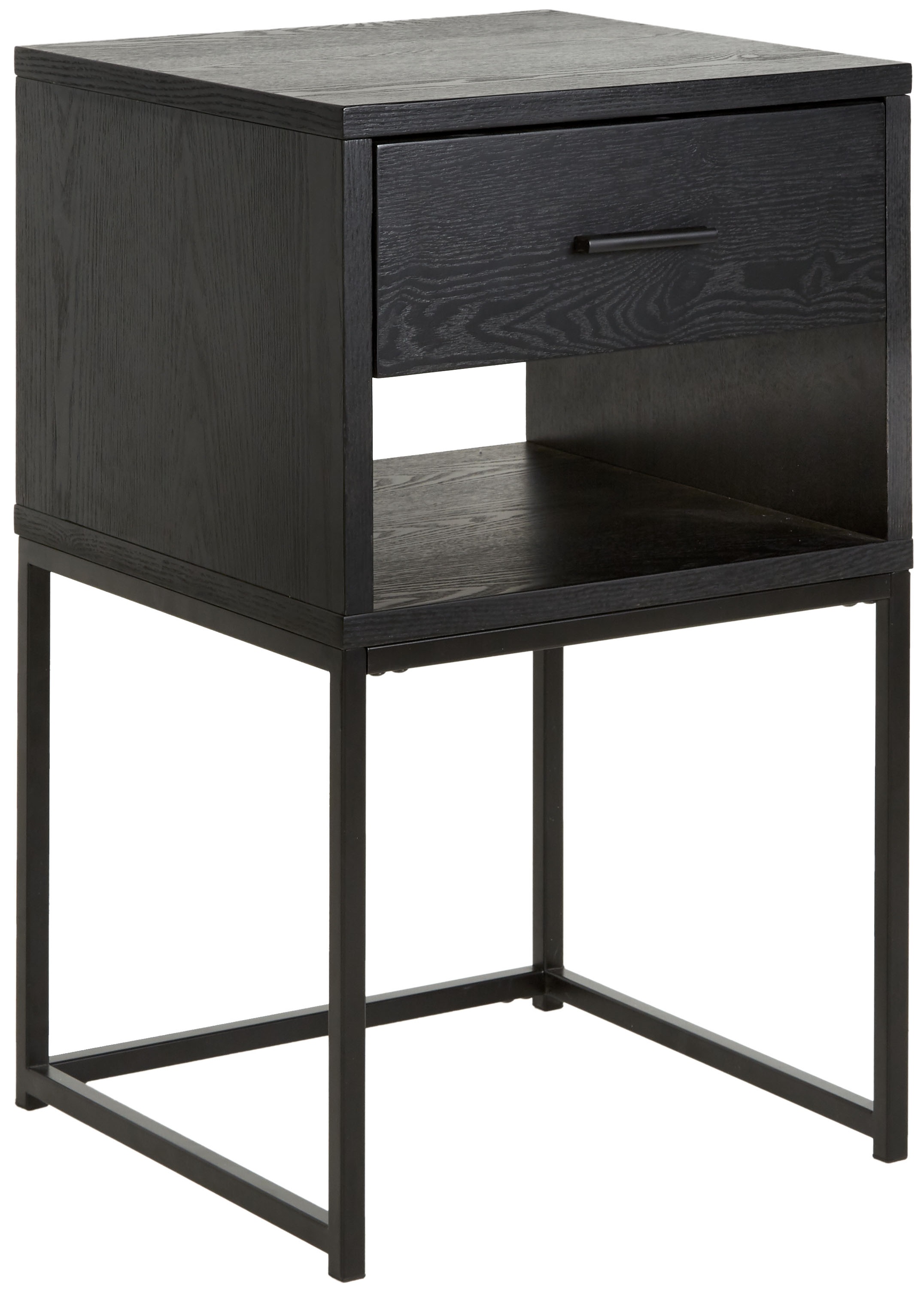 Moderne nattbord i vår serie Alexis. Ramme i svartbeiset ask og ben av matt svartlakkert metall.
