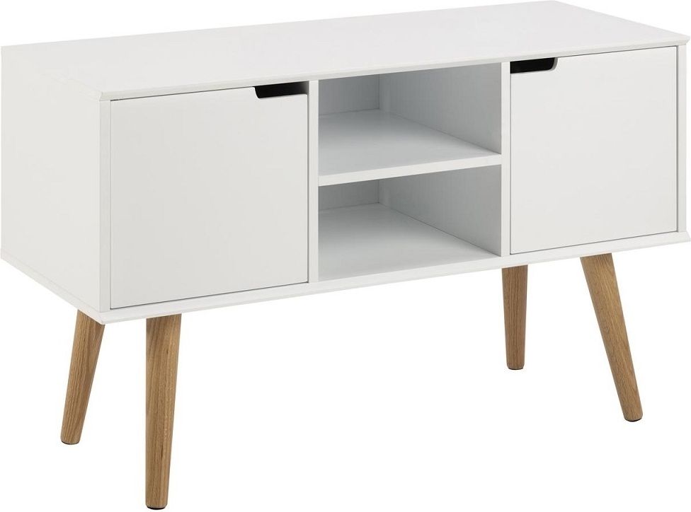 En moderne skjenk fra vår Allentown serie. Hvitmalt eik med to skap og hyller, fungerer også bra som TV-benk siden det er kabelhull. Bordet og beina er av eik.