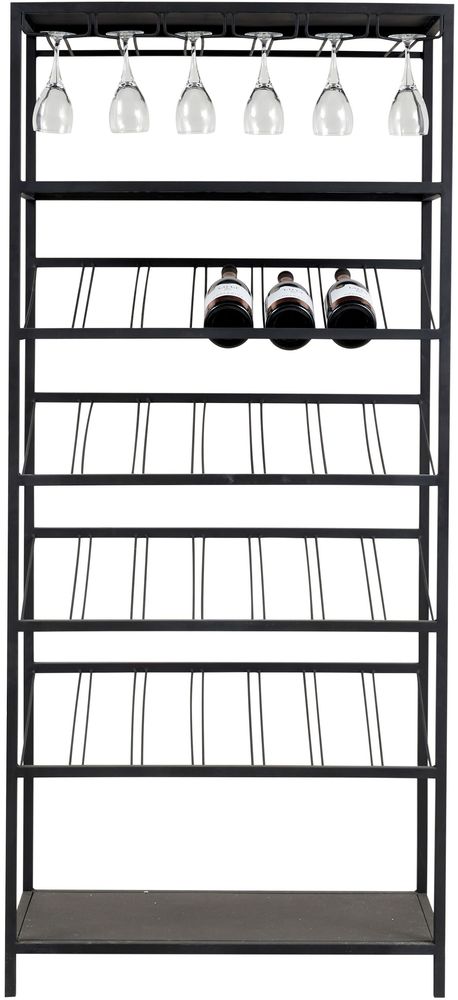 Romslig vinstativ av svart metall som gir plass for både vinflasker og vinglass.