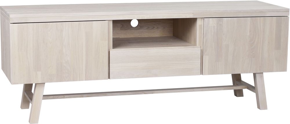 Alyssa mediabenk i hel massiv og fingerskarva eik med soft-close på skuffer og dører.