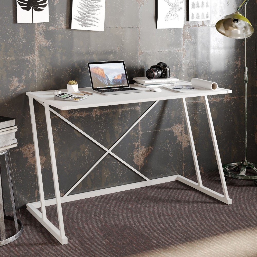 Skrivebord laget av tre og metall.