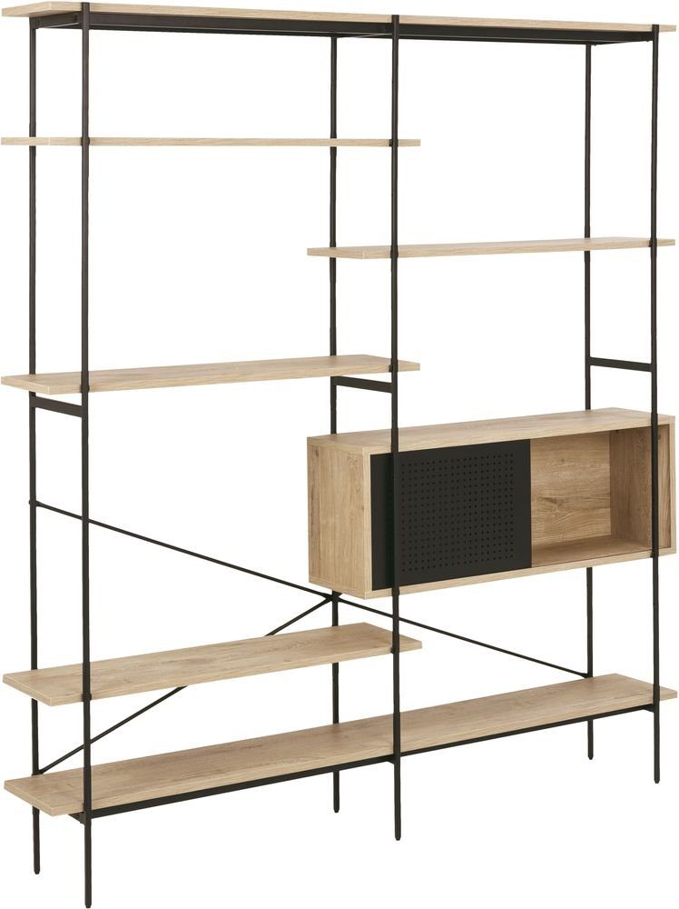 Bokhylle med ramme laget av svart pulverlakkert metall og hylle laget av MDF med eikeimitasjon.