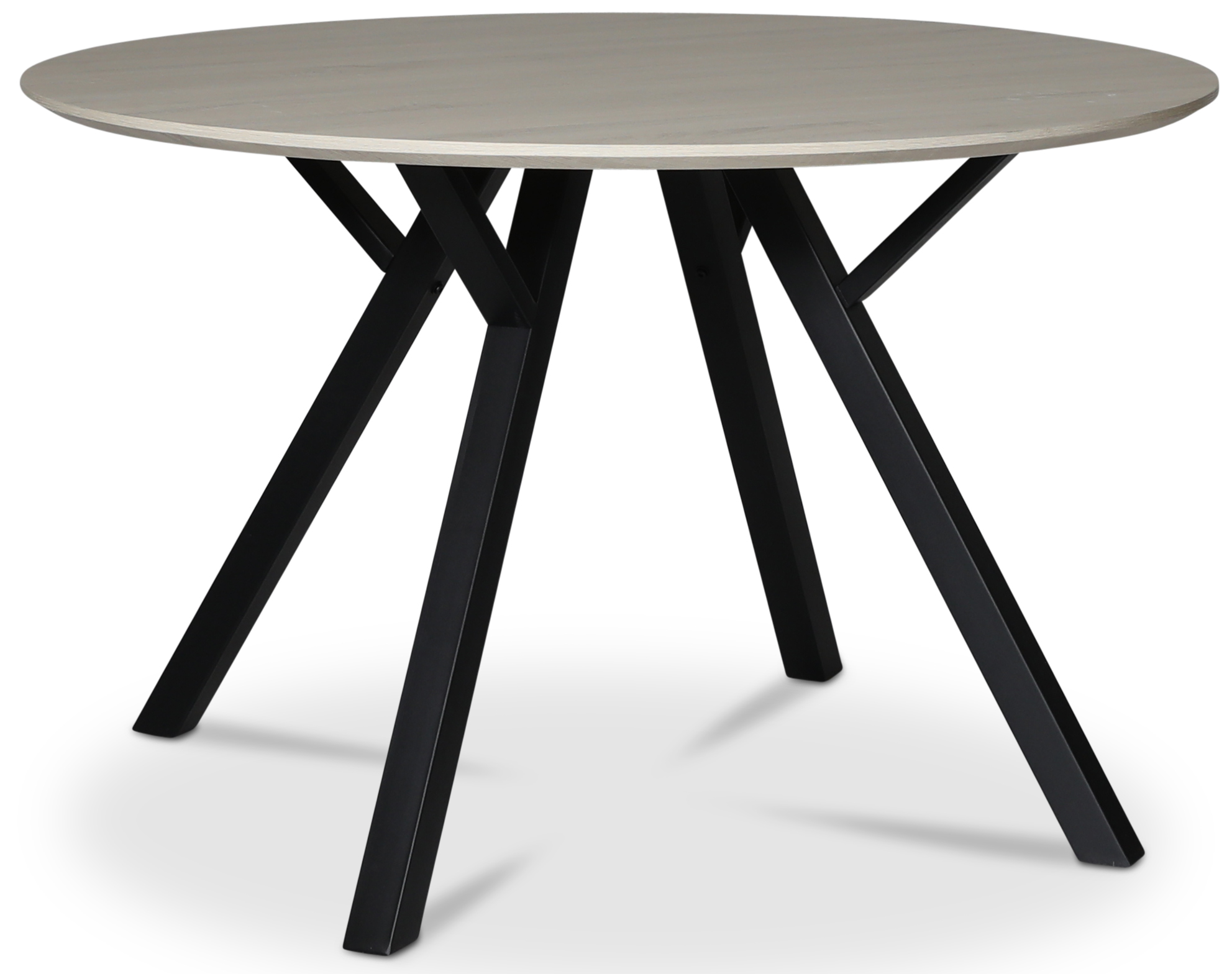 Rundt stilig spisebord med 25 mm tykk topplate av MDF med mønster av whitewash. Stamme av svart metall.