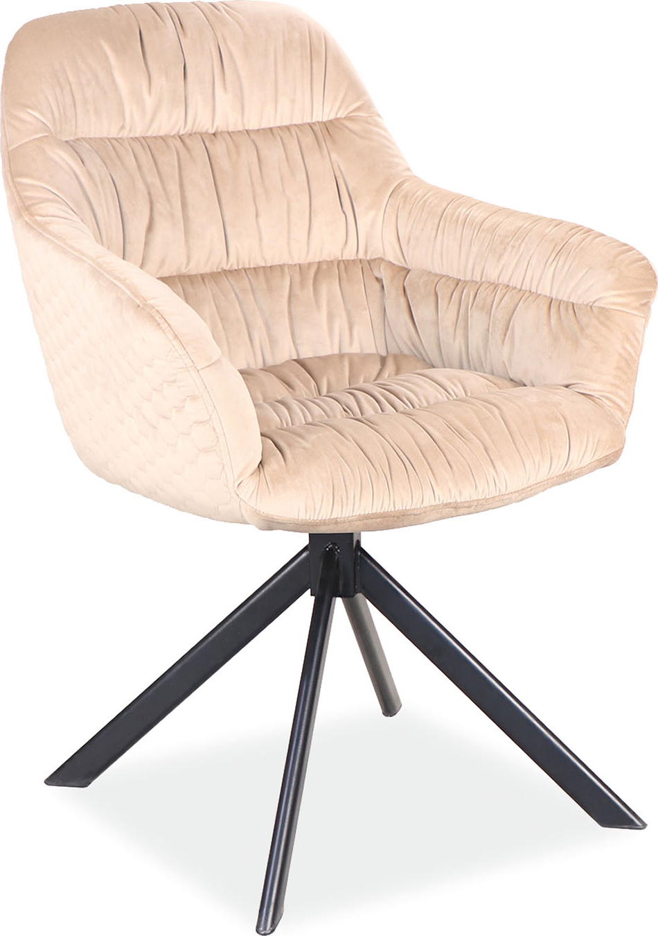 Spisestol laget av metall. Trukket med polyesterstoff.