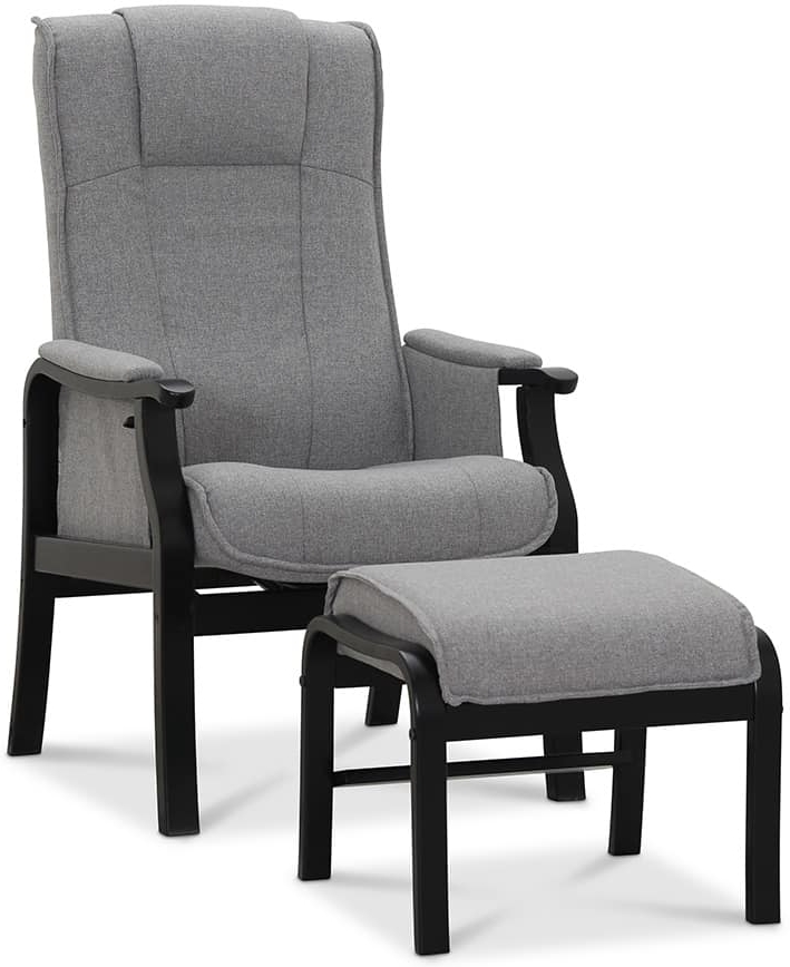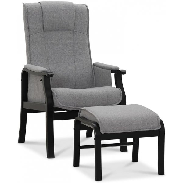 Manuell lenestol med justerbar rygg. Fotskammel inkludert. Kledd i OEKO-TEX sertifisert stoff.