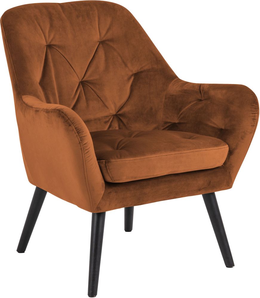 Lenestol kledd med et mykt kobberfarget fløyelstoff og stoppet med FR skum for maksimal komfort. Bena er laget av svartmalt gummitre.