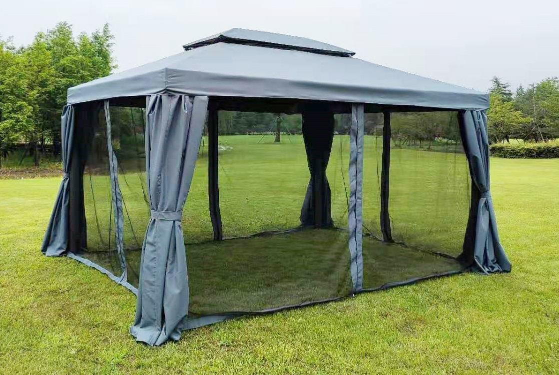 Athen paviljong kan brukes både på solfylte, regnfulle og overskyede dager. Det blir som et ekstra rom i hagen. Stabil metallkonstruksjon med grått slitesterkt trekk som tåler sommervær.
