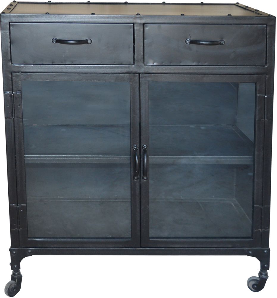 Praktisk skap i metall som står på hjul og enkelt kan flyttes. Laget av metall og har oppbevaringsplass i de to skuffene og hyllene bak glassdørene. Et skap i industriell stil.