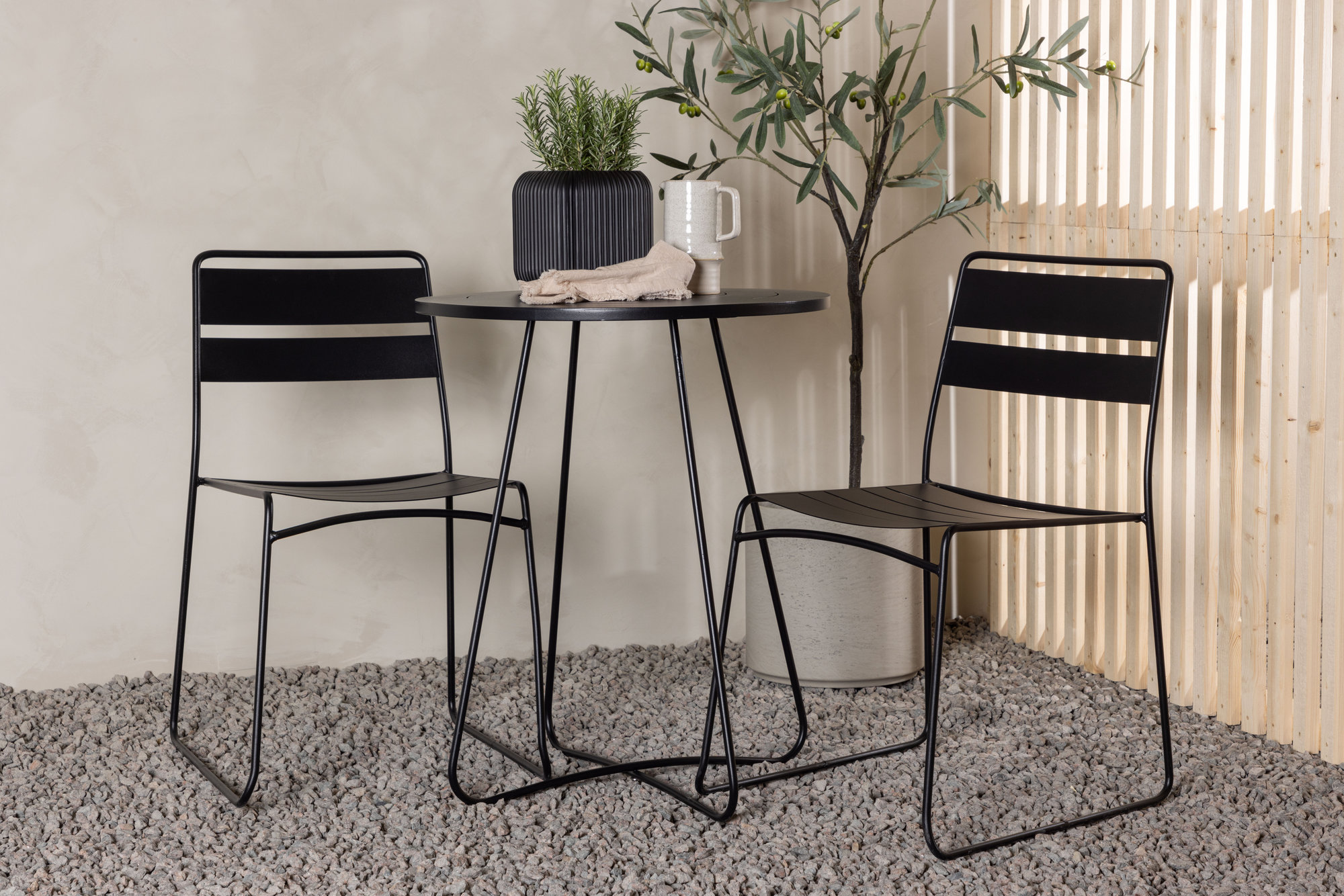 Skap et stilig og minimalistisk blikkfang på terrassen eller balkongen din! Det pene kafébordet fra Bacong-serien har en rund topp og smale ben i sort stål. Her sammen med våre smakfulle spisestuestoler fra Lina-serien. Denne sjarmerende stolen er laget av slitesterkt stål i en sotsvart farge og matcher bordet perfekt. Det skal føles godt å slå seg ned her for en avslappende stund!