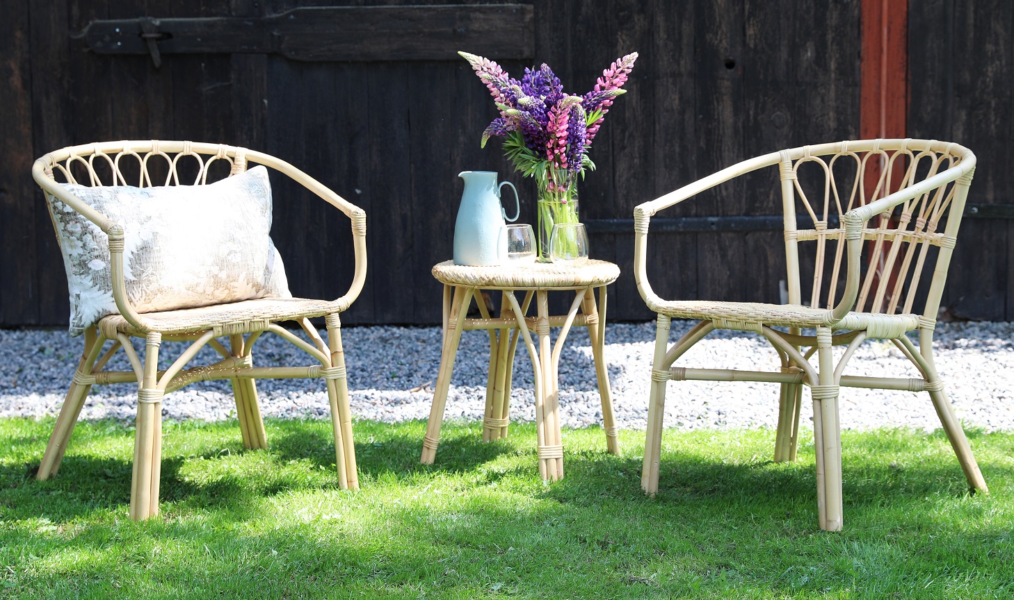 Bali terrassesett i naturfarget rotting. Lettplassert sett til balkongen, terrassen eller uteplassen. To lenestoler og et lite cafèbord.