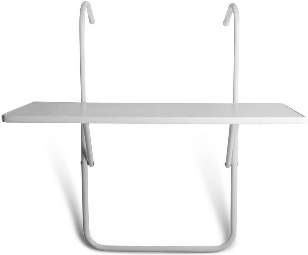 Et pent og praktisk balkongbord i hvit metall og med bordplate i hvit MDF. Henges lett og sikkert på gelenderet.