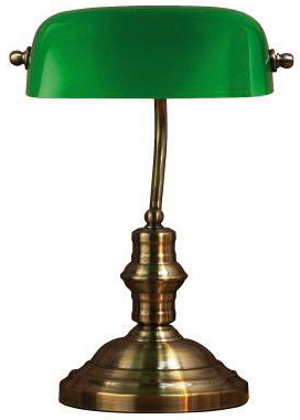 Bankers bordlampe med et klassisk design. Laget i oksidert metall, lampefot og grønn glasskjerm. 2 meter ledning med strømbryter. Liten lampeholder (E14). Max 40W lyspære eller tilsvarende styrke i halogen, lavenergi eller LED.