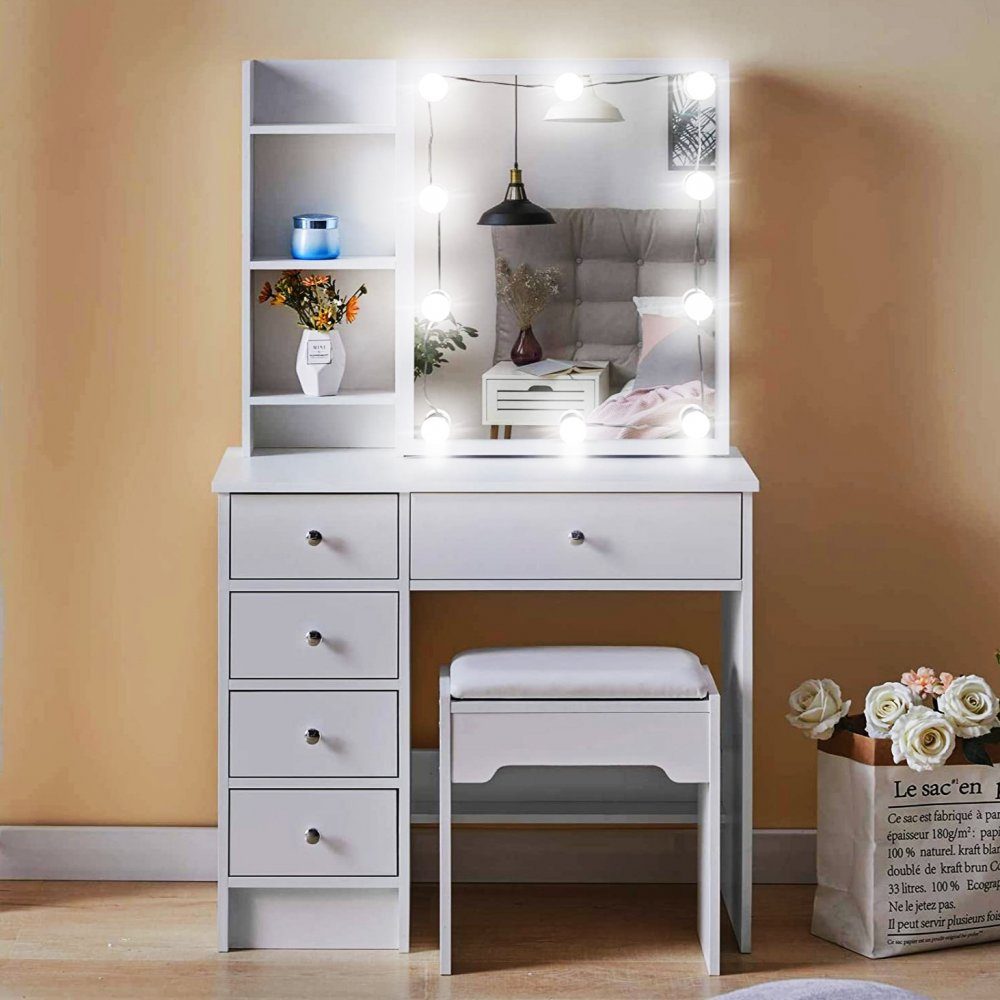 Hvitt sminkebord av tre med 10 LED-lys som gir et klart og justerbart lys, slik at du enkelt kan se hver detalj når du sminker deg. Opplev det ultimate innen skjønnhet og funksjonalitet med vårt elegante hvite sminkebord i tre, designet for å gi deg det perfekte stedet å skape din look. Enten du forbereder deg til en kveld ute eller bare vil se bra ut til hverdags, vil dette sminkebordet bli din beste venn.
