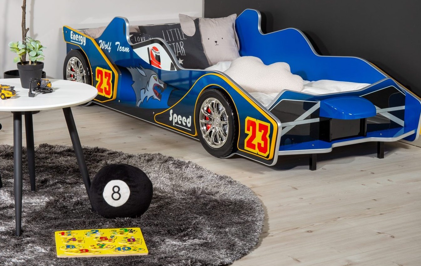 Barneseng for bilentusiasten, blå Formel 1 F! bil i moderne design med belysning i lampene. Føl deg kul mens du farer gjennom rallybanen når du sover søtt.Tenn de batteridrevne frontlyktene på sportbilen. Robust og stabil i lakkert MDF, inkludert treribber.
