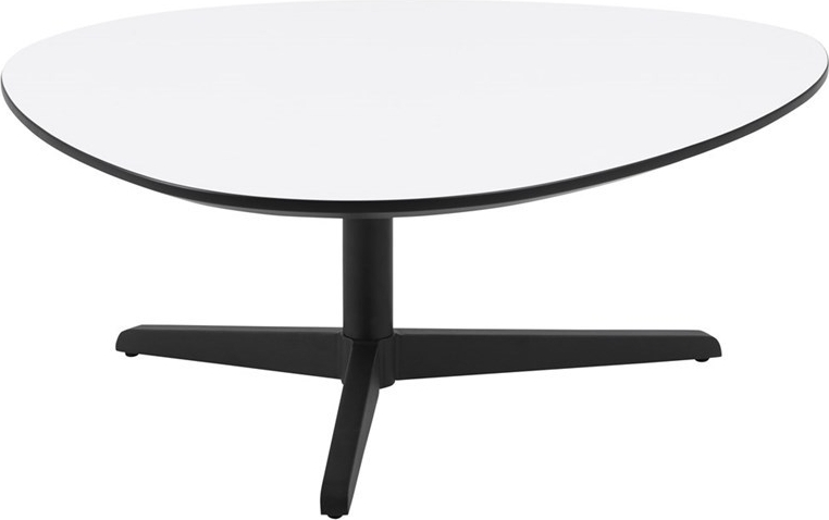 Salongbord med underrede laget i svart metall. Bordsskivan er laget av høytrykkslaminerte sponplater med hvit blank topp og svarte sidor.