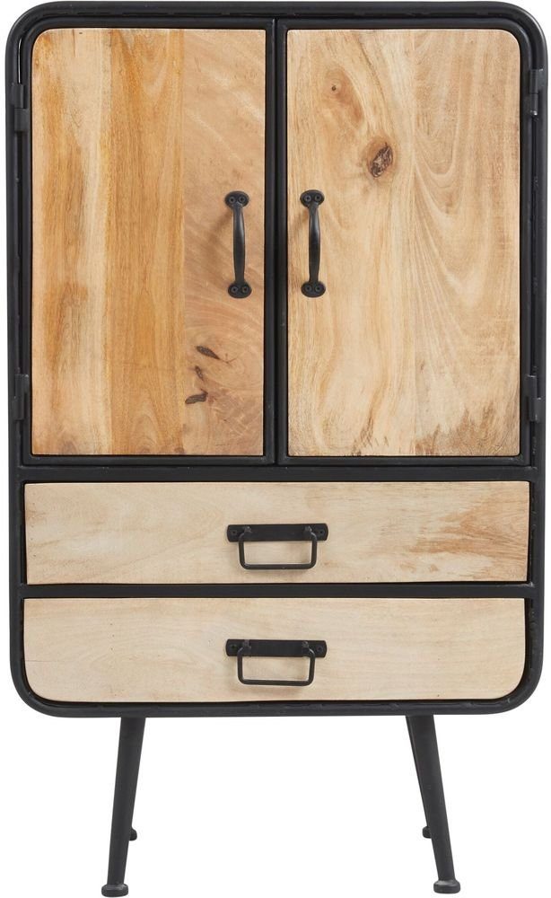 Skap med høye ben. Laget av massivt mangotre med svarte detaljer. Ben av svart metall.