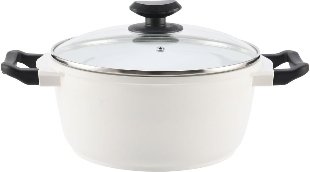 Basis gryte i hvitt og svart med praktisk glasslokk. Laget i aluminium.