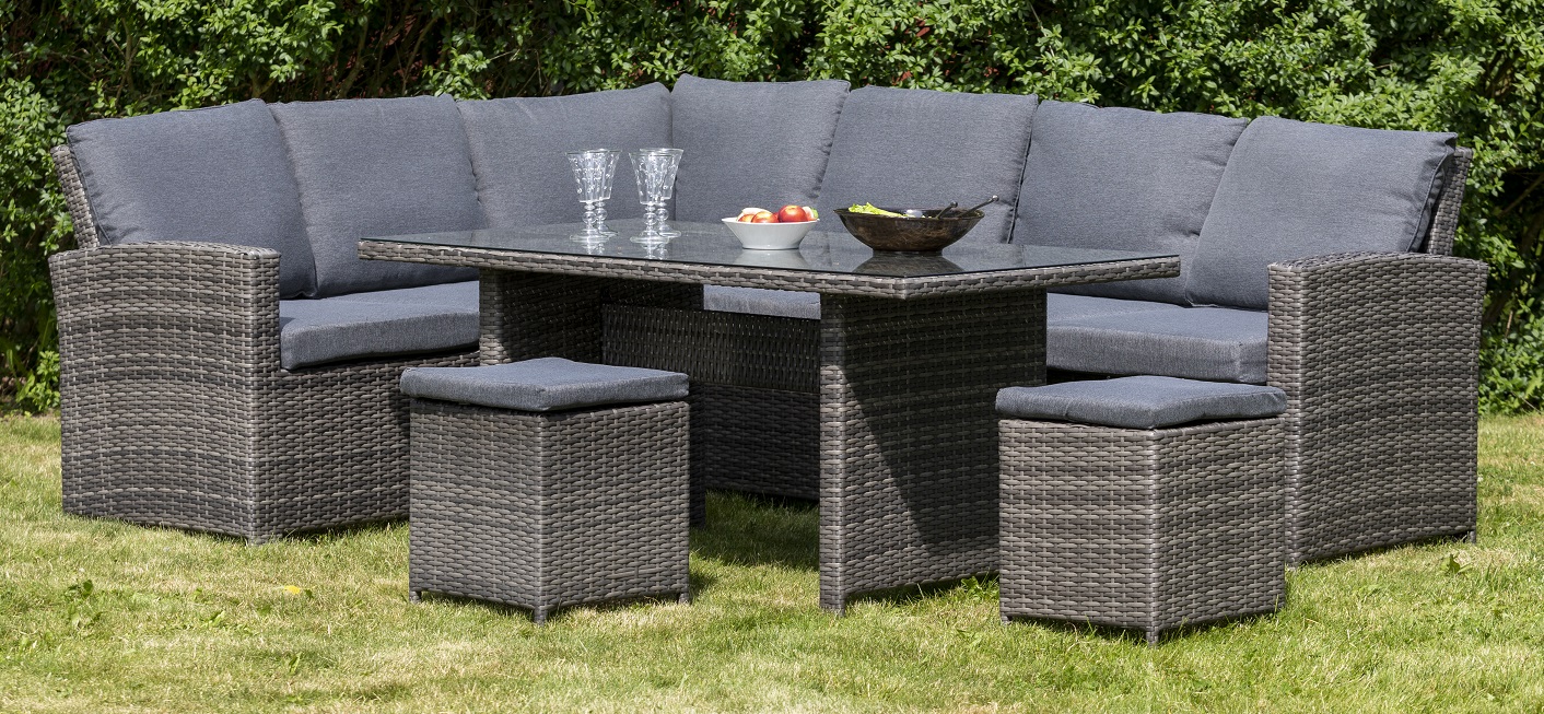 Vellaget sofagruppe for uteplassen som inneholder hjørnesofa med bord pluss sittepuffer. Hele møbelsettet er laget av matchende mørkegrå kunstrotting. Puffene kan praktisk plasseres etter behov.