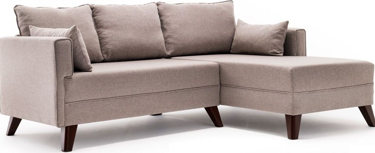 Sofa laget av tre med ben laget av plast og møbeltrekk laget av polyester.