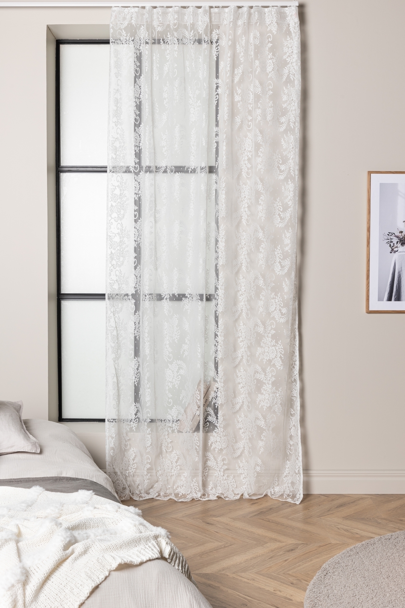 Gardinlengde i et florlett polyestermateriale med blonder.