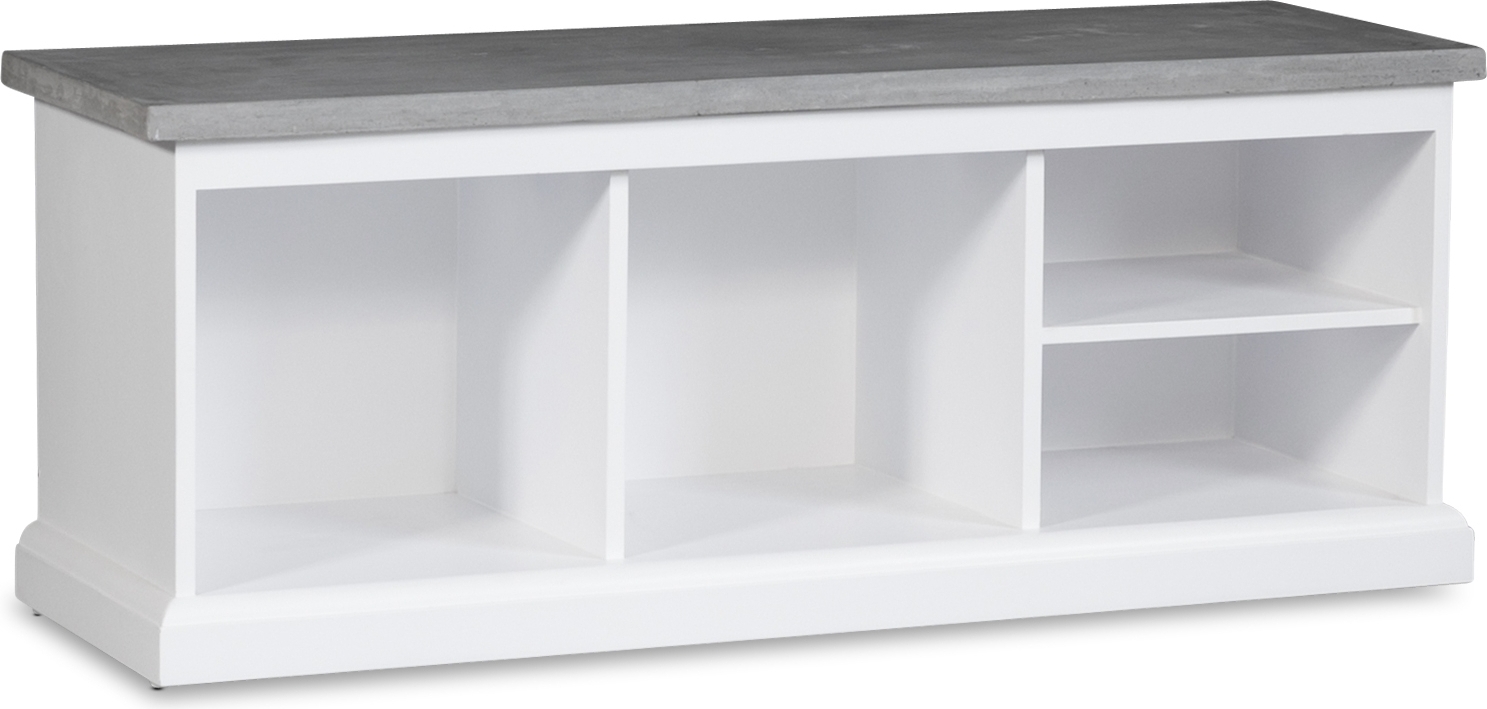 Benk i hvitt tre. Bordplaten er i betong, noe som gjør den ekstra motstandsdyktig. To store oppbevaringsom og to smalere oppbevaringsrom. Kjøp også Hugo oppbevaringskurver.