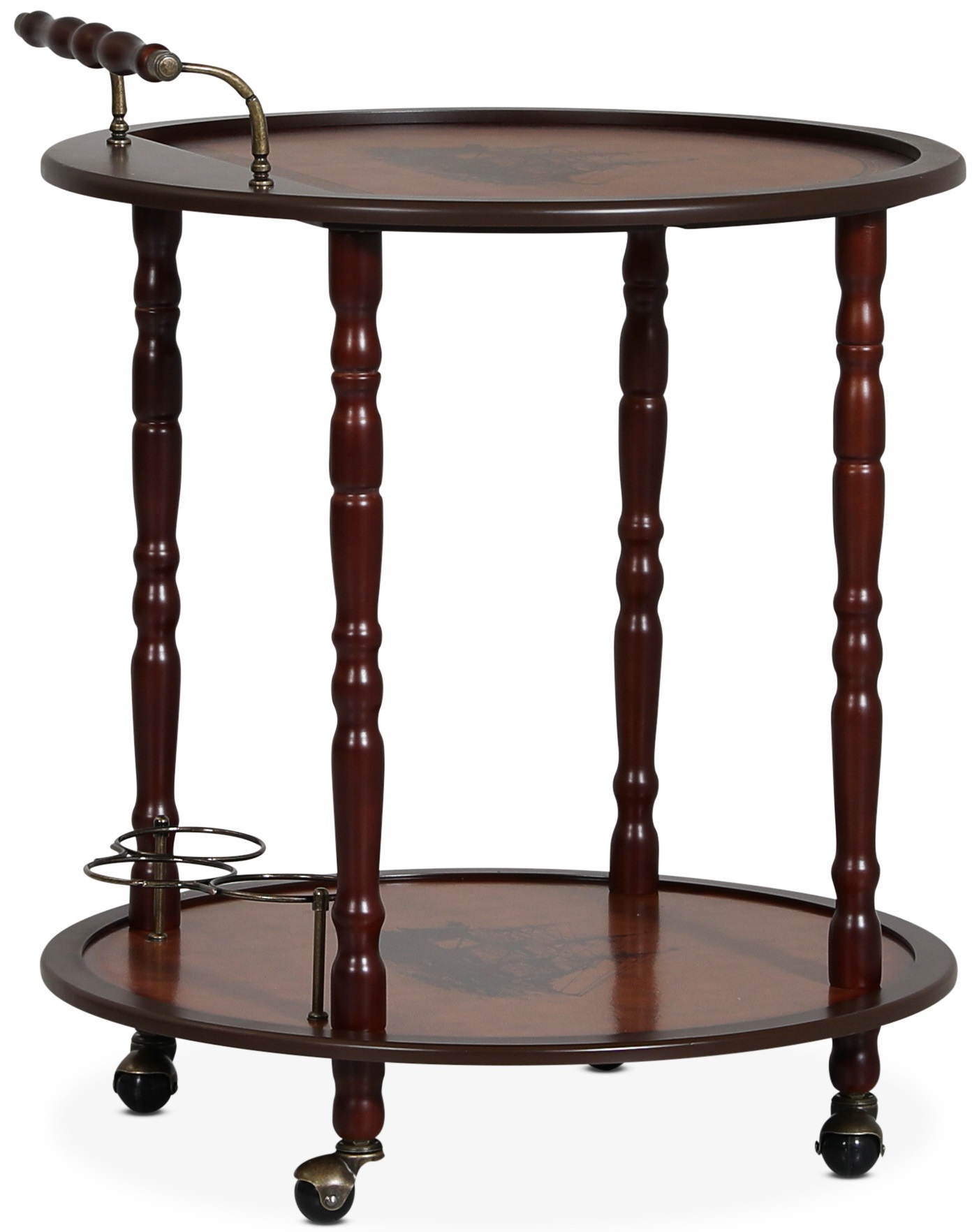 En tradisjonell serveringsvogn med klassisk design. Laget av MDF og massivt tre med pent og detaljert trelaminat. Den nedre hyllen har praktiske flaskeholdere som holder flaskene stabile når du flytter vognen. Denne serveringsvognen er ansett som dekorasjon og bør lastes med en maksimal vekt på 20kg.