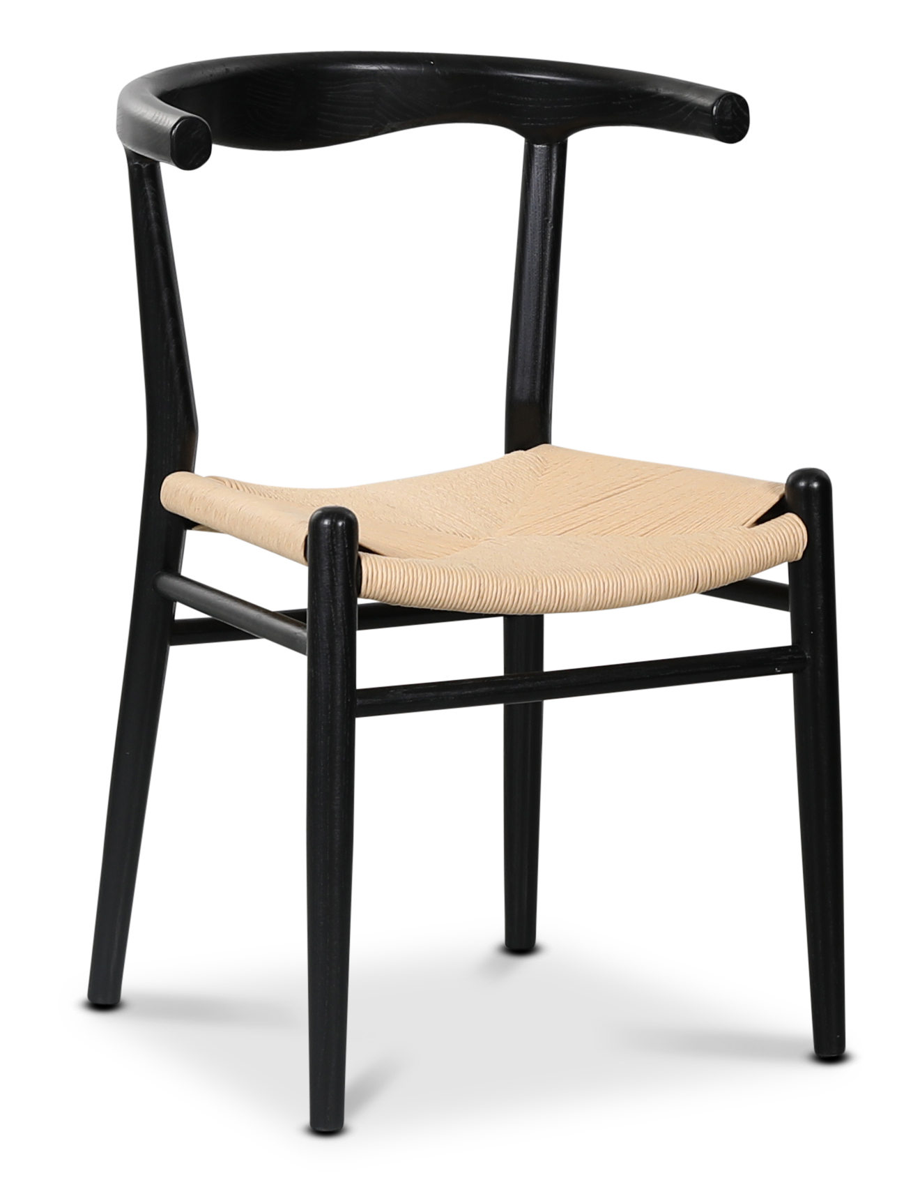 Klassisk spisestol i karm-modell i svartmålat massivt alm tre og sete i flettet papirsnøre. Leveres montert.