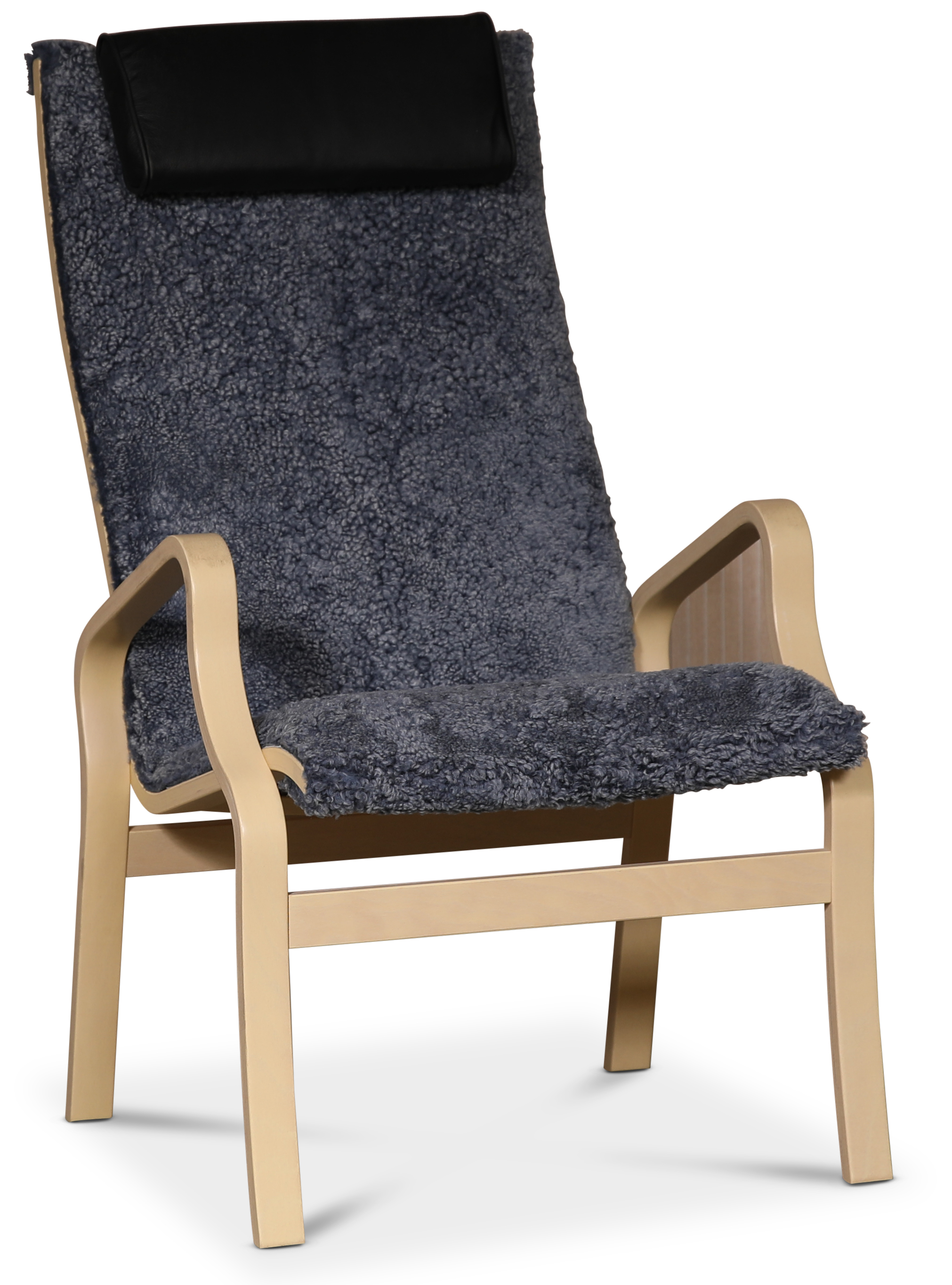 Bern lenestol er designet i Danmark av Nielsen design med følelse for det skandinaviske hjemmet. Møblene er kledd i grått ekte saueskinn med gjennomarbeidede armlener i hvitkalket bøk. En designklassiker som varer for fremtiden. Lenestolen kan brukes både med og uten medfølgende nakkepute i ekte sort skinn.