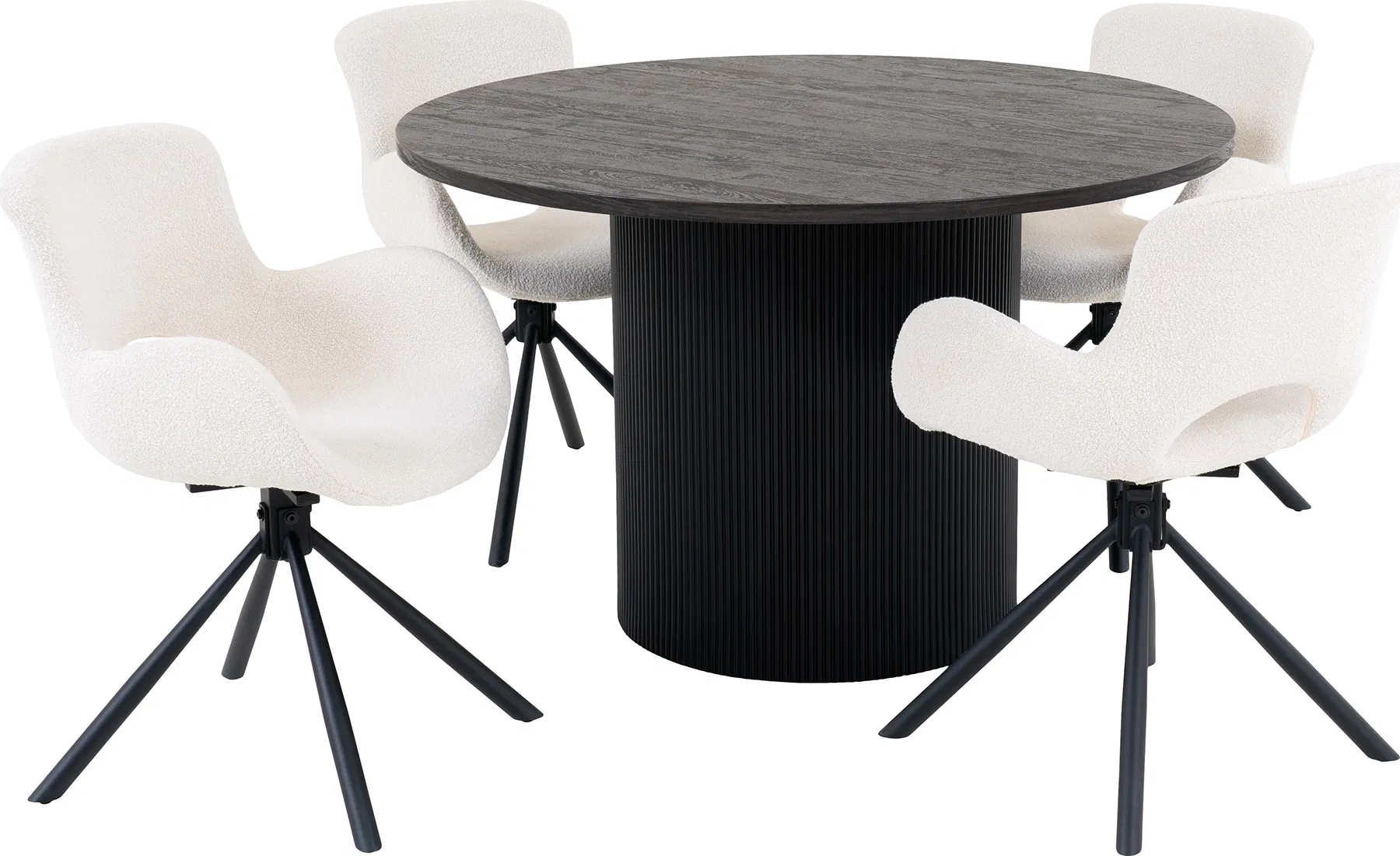 Spisegruppe bestående av Boavista spisebord i mørkebrun og 4 svingbare Amotim spisestoler i off-white boucléstoff. Leveres umontert.