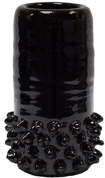 Vase av glansfull svart terrakotta med pigger i bunnen.