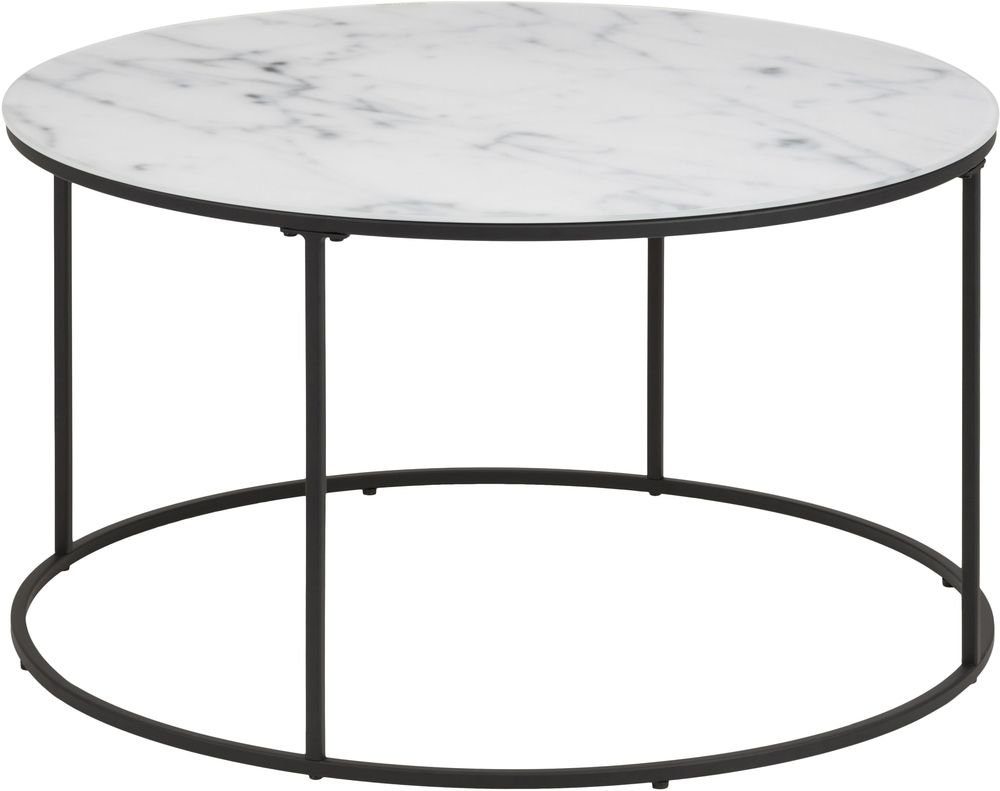 Salongbord med topplate laget av glass med hvit mønstret marmor trykk og ramme av svart pulverlakkert metall.
