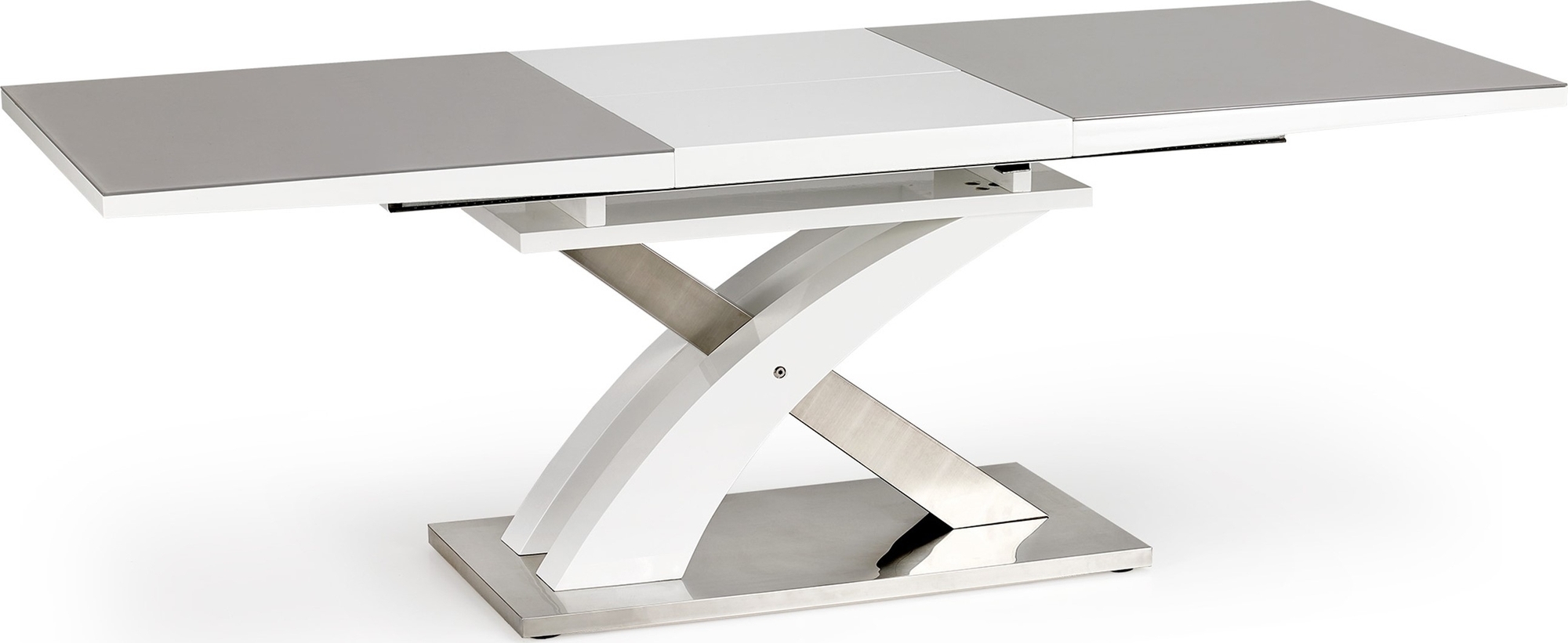Et elegant spisebord med et moderne design. Underdelen er laget i lakkert & forkrommet metall og MFP (premium treplate), bordplaten er i hvitlakkert MFP (premium treplate) med solid grått glass. Bordet kan lett forlenges fra 160 cm til 220 cm, perfekt når man har et litt større selskap.