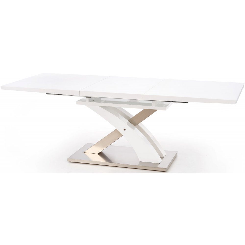 Et elegant spisebord med et moderne design. Understellet er produsert i lakkert & krommet metall og MFP (premium treplate), bordplaten er i hvitlakkert MFP (premium treplate). Bordet kan enkelt forlenges fra 160 cm til 220 cm, perfekt når man skal ha et litt større selskap.