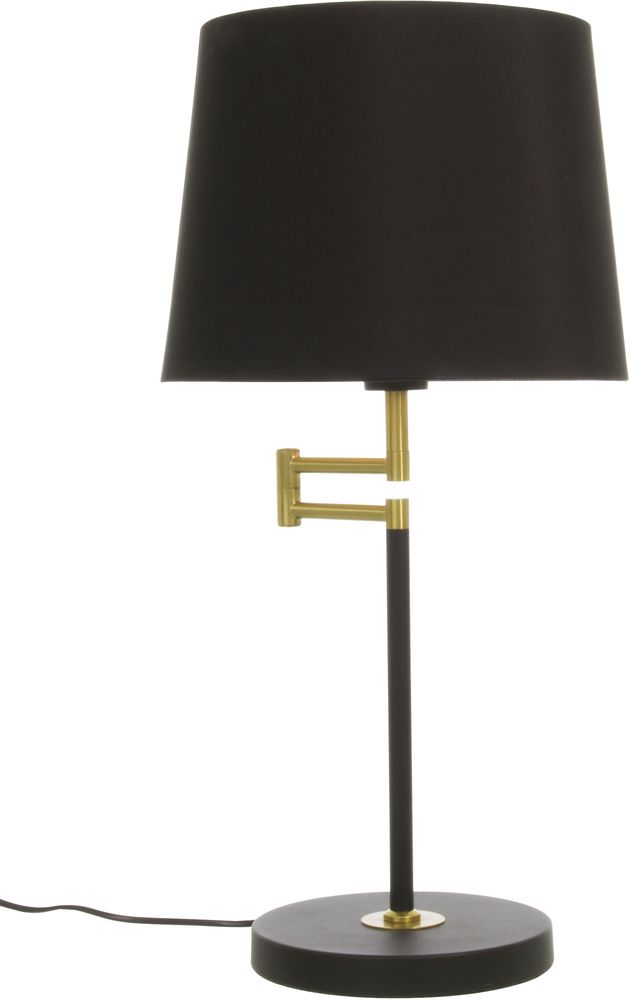 Bordlampe i metall med svart og matt messingdesign. Lampeskjerm i tekstil følger med.