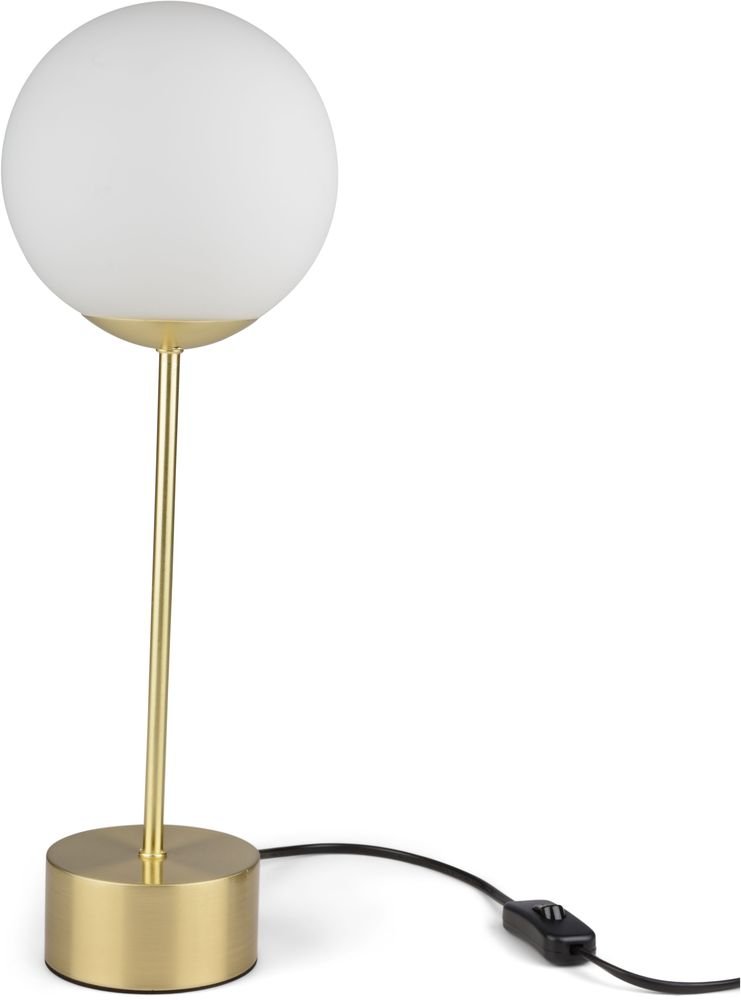 En praktisk bordlampe med gullfarget metallfot og hvit glasskuppel.