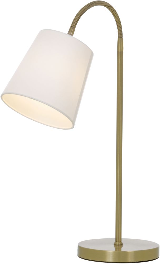 Bordlampe i metall i antikk messingutførelse. Lampeskjerm i tekstil følger med.