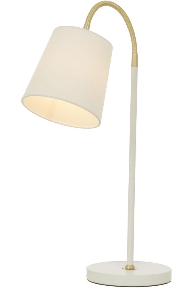 Bordlampe i metall i hvit og matt messingutførelse. Lampeskjerm i tekstil følger med.