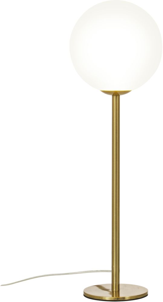 Bordlampe i metall i matt messingutførelse og glasskuppel i opalhvit.