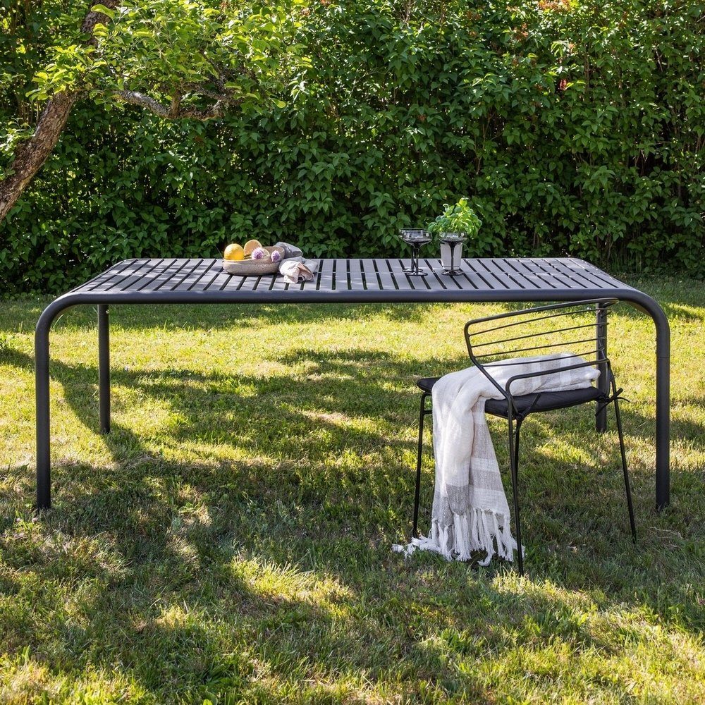 Spisebordet fra Borneo-serien har fleksible former og et tidløst skandinavisk design! Bordplaten er ribbet og bølger langs kantene ved bena. Helt laget i sort aluminium, som gir deg et slitesterkt bord som er lett å flytte rundt på. Match med et par komfortable spisestoler og du vil få en komplett spisegruppe som vil lyse opp deilige måltider på terrassen din!
